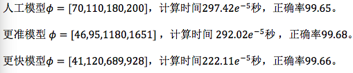 我们看看人工模型,人工模型【70、110、180、200】,计算时间是这样的,现在它的正确率是99.65%。我们的算法给出了两个更好的模型,一个是识别率更高,一个是速度更快。