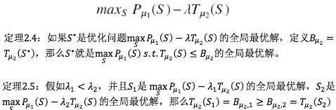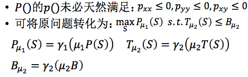 所以我们就做了一个函数变换,函数变换实际是在原来的函数上乘一个正数𝜇1,作用于𝛾这个函数,把它变换成一个子模函数。如果𝛾这个函数选择的好,例如是个单调函数,那么,P()和P𝜇1这两个函数是单调的,所以在相同的地方取最大值,因此不影响我们优化问题结果。这个里面,𝜇 1, 𝜇2 正整数,𝛾1 ,𝛾 2单调递增函数。