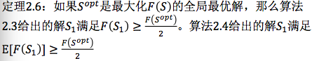 下面这个结论告诉说,刚才这里有两种算法,我可以给它一个理论保障,这个理论保障是这样的。如果这个So是整个这个问题的全局最优解,刚才第一个确定性的算法给出的解S1大于它的1/2, 2.4这个算法给出的解的数学期望是也是大于最优解的1/2。这样一来我们就知道这个算法有理论的下界,这件事告诉我们什么?你可以放心大胆的用这个算法。