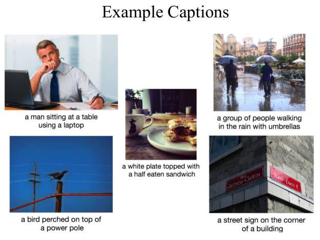 图像描述是这样一个问题,给你一张图像,你给我生成一个句子来描述这个图像。原来的图像分类可以说是一个词,现在必须是一个句子。这两个其实会有本质的差异,后者更关注物体之间的关系。以前分类只是说,有人、有笔记本、有只鸟、有电线杆,仅此而已,但是并没有区分他们之间是什么关系。图像描述要说他们的关系,而且说关系的时候要自然语言描述,所以有很多不一样的地方。