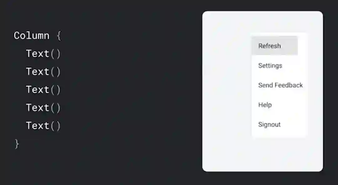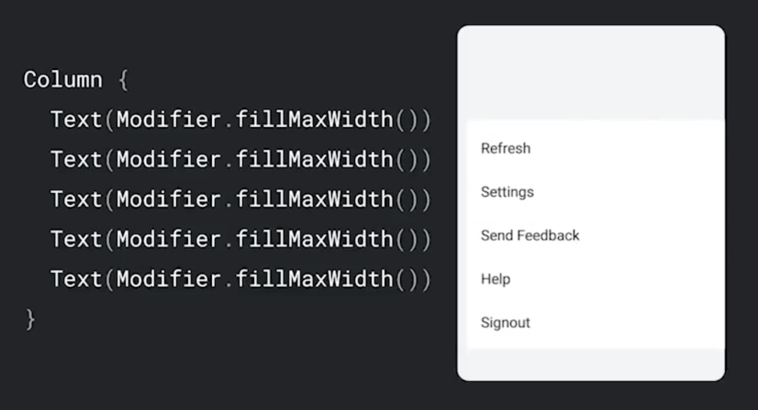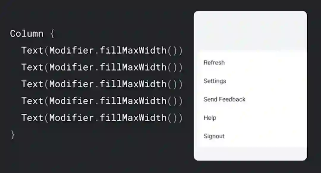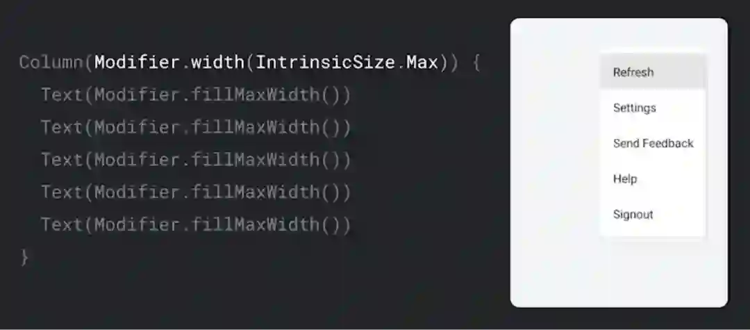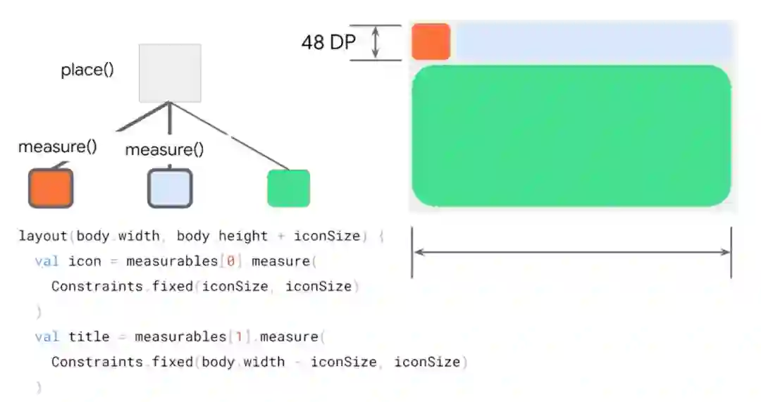 measure 函数还会接受 List<Measurable> 作为参数,这表示的是传入的子元素。Measurable 类型会公开用于测量项目的函数。如前所述,布局每个元素需要三步: 每个元素必须测量其所有子元素,并以此判断自身尺寸,再放置其子元素。其代码实现如下:
