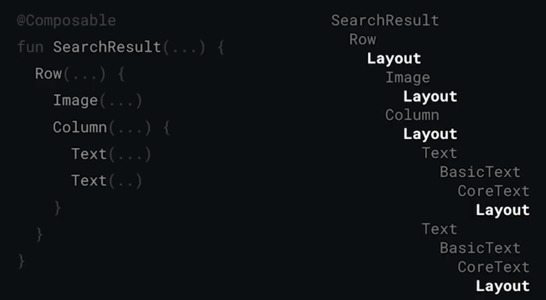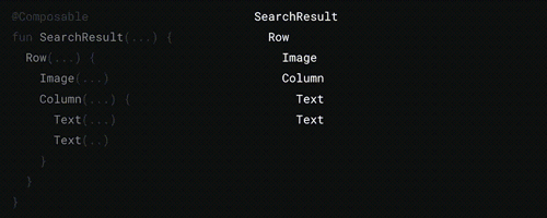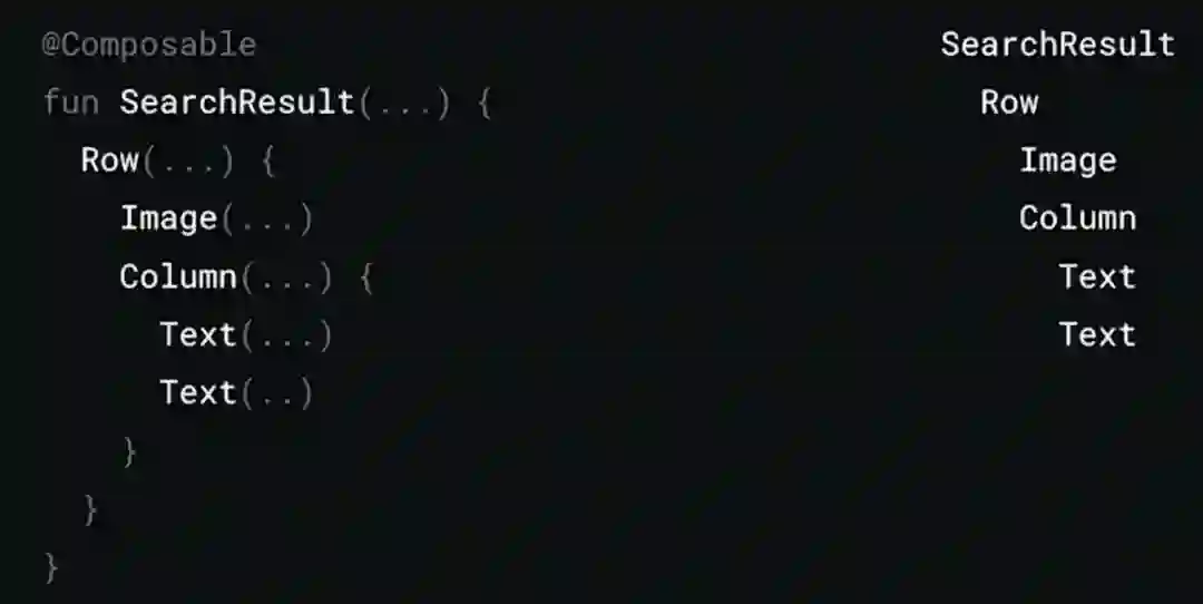 Jetpack Compose 可将状态转换为界面,这个过程分为三步: 组合、布局、绘制。组合阶段执行可组合函数,这些函数可以生成界面,从而创建界面树。例如,下图中的 SearchResult 函数会生成对应的界面树: