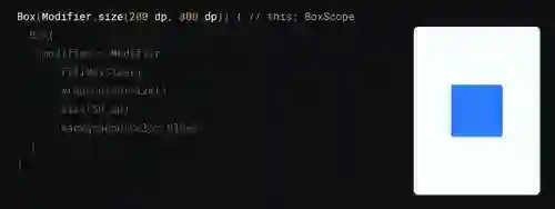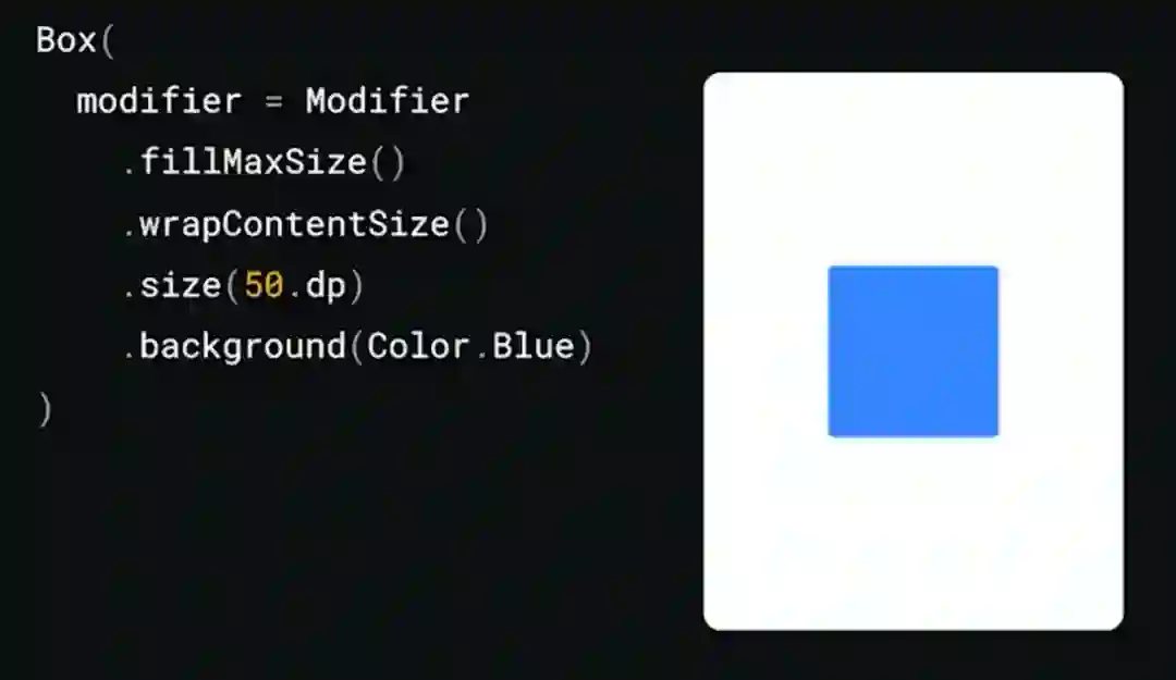假设这个 Box 要放入最大尺寸为 200*300 像素的容器内,容器会将相应的约束传入修饰符链的第一个修饰符中。fillMaxSize 实际上会创建一组新约束,并设置最大和最小宽度与高度,使之等于传入的最大宽度与高度以便填充到最大值,在本例中是 200*300 像素。这些约束沿着修饰符链传递以测量下一个元素,wrapContentSize 修饰符会接受这些参数,它会创建新的约束来放宽对传入约束的限制,从而让内容测量其所需尺寸,也就是宽 0-200,高 0-300。这看起来只像是对 fillMax 步骤的反操作,但请注意,我们是使用这个修饰符实现项目居中的效果,而不是重设项目的尺寸。这些约束沿着修饰符链传递到 size 修饰符,该修饰符创建具体尺寸的约束来测量项目,指定尺寸应该正好是 50*50。最后,这些约束传递到 Box 的布局,它执行测量并将解析得到的尺寸 (50*50) 返回到修饰符链,size 修饰符因此也将其尺寸解析为 50*50,并据此创建放置指令。然后 wrapContent 解析其大小并创建放置指令以居中放置内容。因为 wrapContent 修饰符知道其尺寸为 200*300,而下一个元素的尺寸为 50*50,所以使用居中对齐创建放置指令,以便将内容居中放置。最后,fillMaxSize 解析其尺寸并执行放置操作。