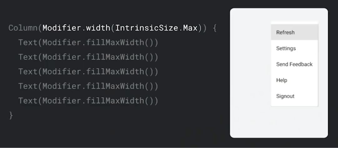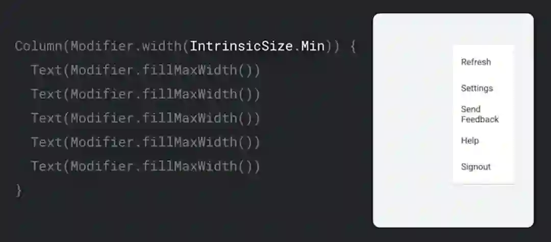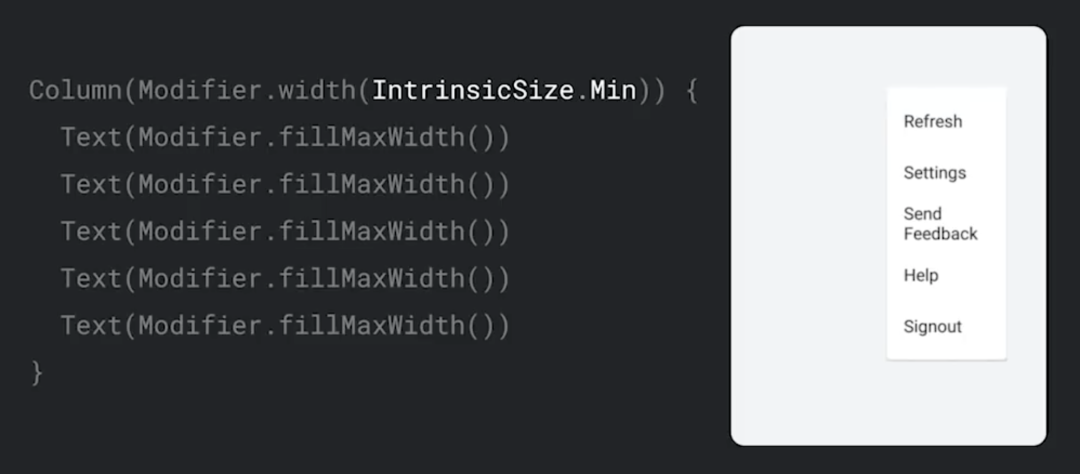 这里确定了 Column 会尽力为每个子节点提供所需的空间,对 Text 而言,其宽度是单行渲染全部文本所需的宽度。在确定固有尺寸后,将使用这些值设置 Column 的尺寸,然后,子节点就可以填充 Column 的宽度了。