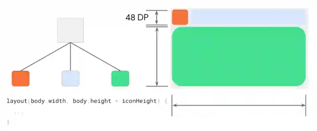 图标和标题构成标题栏,剩下的是正文。已知图标大小为固定值,标题高度与图标高度相同。测量卡片时,就只需要测量正文,它的约束就是布局高度减去 48 DP,卡片的高度则为正文的高度加上 48 DP。