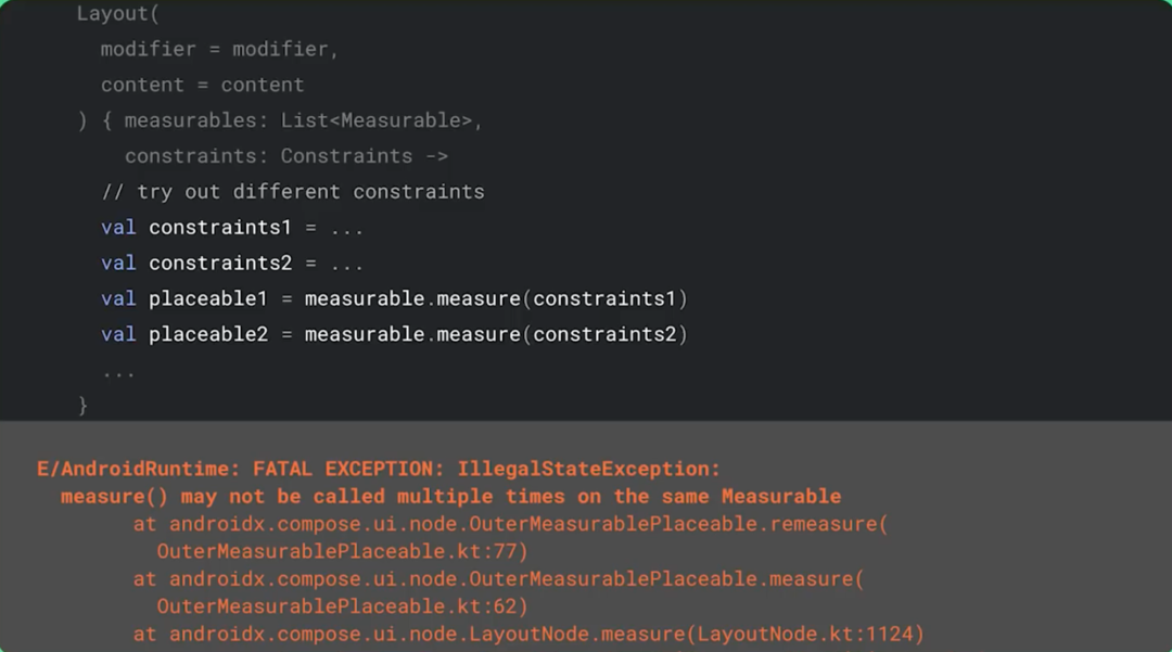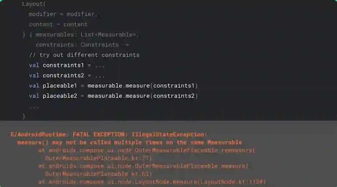 这种设计的优点在于我们可以单遍测量整棵界面树,并且禁止执行多个测量循环。这是 View 系统中存在的问题,嵌套结构执行多遍测量过程可能会让叶子视图上的测量次数翻倍,Compose 的设计能够防止发生这种情况。实际上,如果您对某个项目进行两次测量,Compose 会抛出异常: