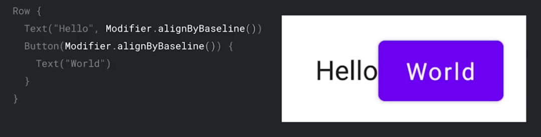 首先,对 Text 使用 alignByBaseline 修饰符。而图标既没有基线,也没有其他对齐线,我们可以使用 alignBy 修饰符让图标对齐到我们需要的任何位置。在本例中,我们知道图标的底部是对齐的目标位置,因此将图标的底部进行对齐。最终便实现了期望的效果: