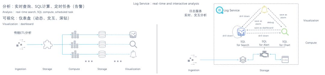使用SQL进行交互查询,可以进行探索式分析,快速进行假设和验证。可反复在原始数据上进行任意维度的计算。而流计算在计算完原始数据后,即抛弃了原始数据,若想回溯调整查询,基本不可能。所以日志服务的交互式查询可谓灵活很多。