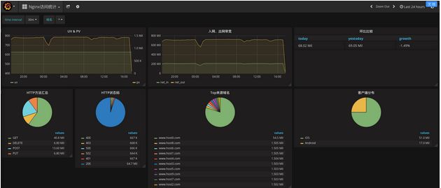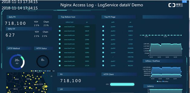 DataV无缝支持LOG API,使用SQL进行实时计算,统计Nginx日志的PV、UV网络等指标。