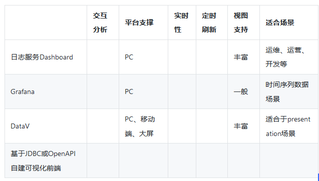 大屏的选择可选方案有日志服务Dashboard,Grafana,Datav等,也可以通过API、JDBC接口对接自己的可视化大屏和第三方的软件(例如Tableua)。日志㐏对三种大屏提供了插件,只需在配置中直接使用SQL进行计算,并展示结果。