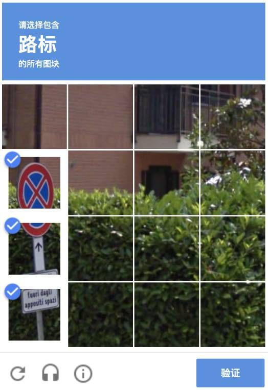 :以图像识别为例,一旦把图像本身放到具体环境中,由于发生了变形、遮挡或者反光等,现在的算法就难于将它准确识别出来。举个例子,在使用 Google 搜索时,很多人可能遇到过一种人机身份验证方式:在下列图片中选出含有交通标志的那些,如下图所示: