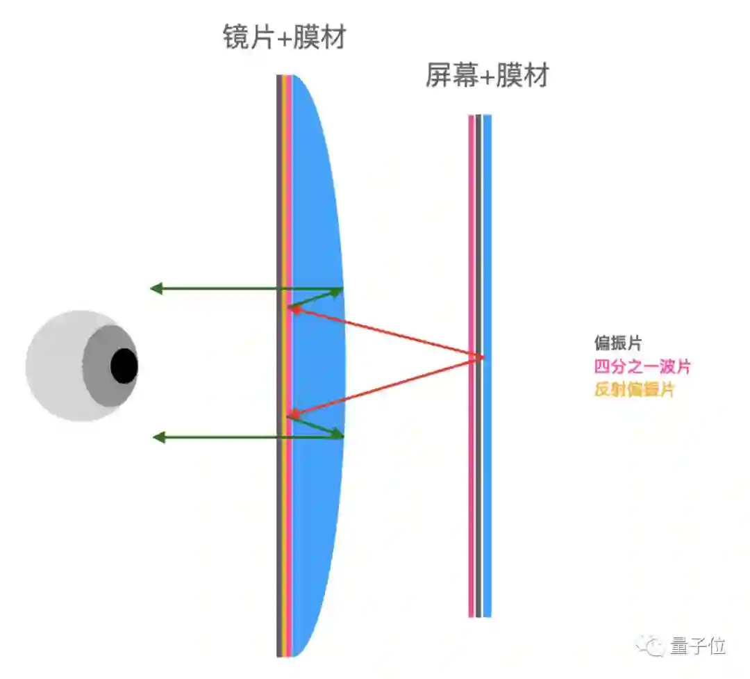 如下图,灰色的膜代表偏振片,粉色的膜代表四分之一波片,橙色的膜代表反射偏振片,分别贴在单个镜片和屏幕上:
