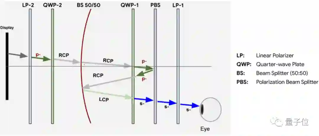 Pancake光学方案实现折叠光路的原理,主要基于4种组件:线性偏振片(LP)、四分之一相位延迟片(QWP)、半反半透镜(BS)和反射偏振片(RP或PBS)。