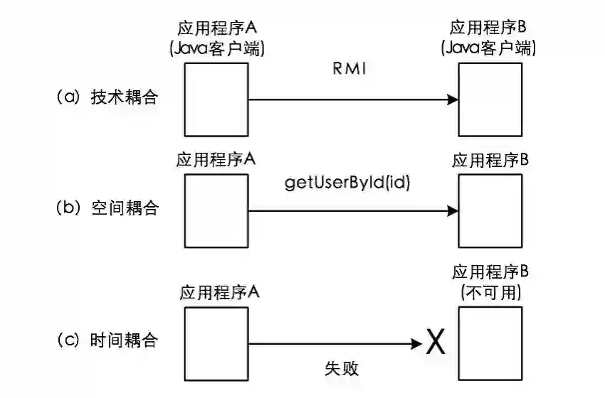 从软件设计上讲存在三种不同层级的耦合度,即技术耦合、空间耦合和时间耦合。技术耦合度表现在服务提供者与服务消费者之间需要使用同一种技术实现方式。如图1-6a中服务提供者与服务消费者都使用RMI(Remote Method Invocation)作为通信的基本技术,而RMI是Java领域特有的技术,也就意味着其他服务消费者想要使用该服务也只能采用Java作为它的基本开发语言;空间耦合度指的是服务提供者与服务消费者都需要使用统一的方法签名才能相互协作,图1-6b中的getUserById(id)方法名称和参数的定义就是这种耦合的具体体现;而时间耦合度则表现在服务提供者与服务消费者只有同时在线才能完成一个完整的服务调用过程,如果出现图1-6c中所示的服务提供者不可用的情况,显然,服务消费者调用该服务就会发生失败。