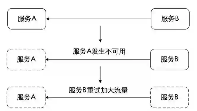在微服务架构中,我们经常会提到雪崩效应(Avalanche Effect)这一概念。服务雪崩的产生是一种扩散效应。当系统中存在两个服务A和B,如果A服务出现问题,而B服务会通过用户不断提交服务请求等手工重试或代码逻辑自动重试等手段进一步加大对A服务的访问流量。因为B服务使用同步调用,会产生大量的等待线程占用系统资源。一旦线程资源被耗尽,B服务提供的服务本身也将处于不可用状态,整个过程的演变可参考图1-5。而这一效果在整个服务访问链路上进行扩散,就形成了雪崩效应。