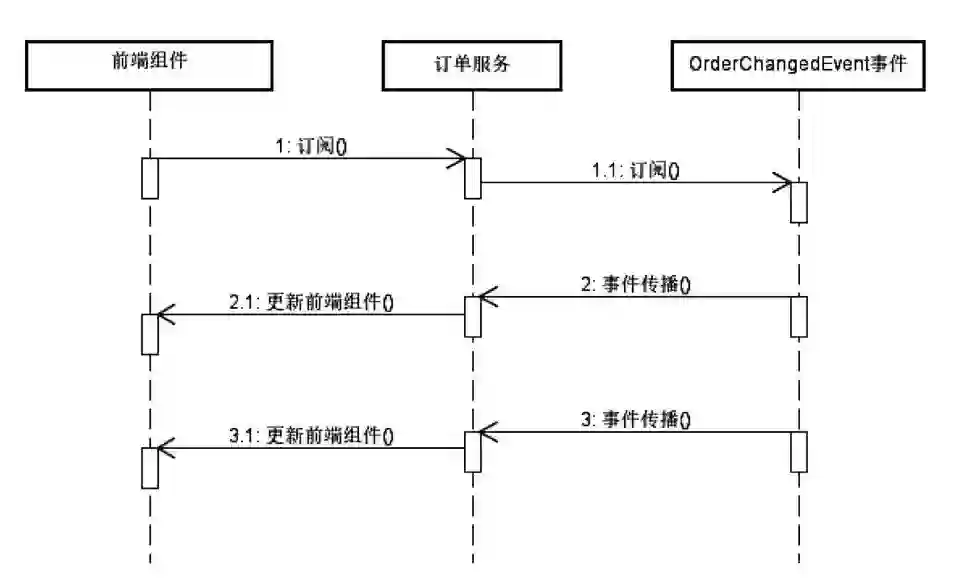 在图1-2中,我们并不是直接访问数据库来获取数据,而是订阅了OrderChangedEvent事件。当订单数据发生任何变化时,系统就会生成这一事件,然后通过一定的方式传播出来。而订阅了该事件的服务就会捕获该事件,从而通过前端组件响应该事件。事件处理的基本步骤涉及对某个特定事件进行订阅,然后等待事件的发生。如果不需要再对该事件做出响应,我们就可以取消对事件的订阅。