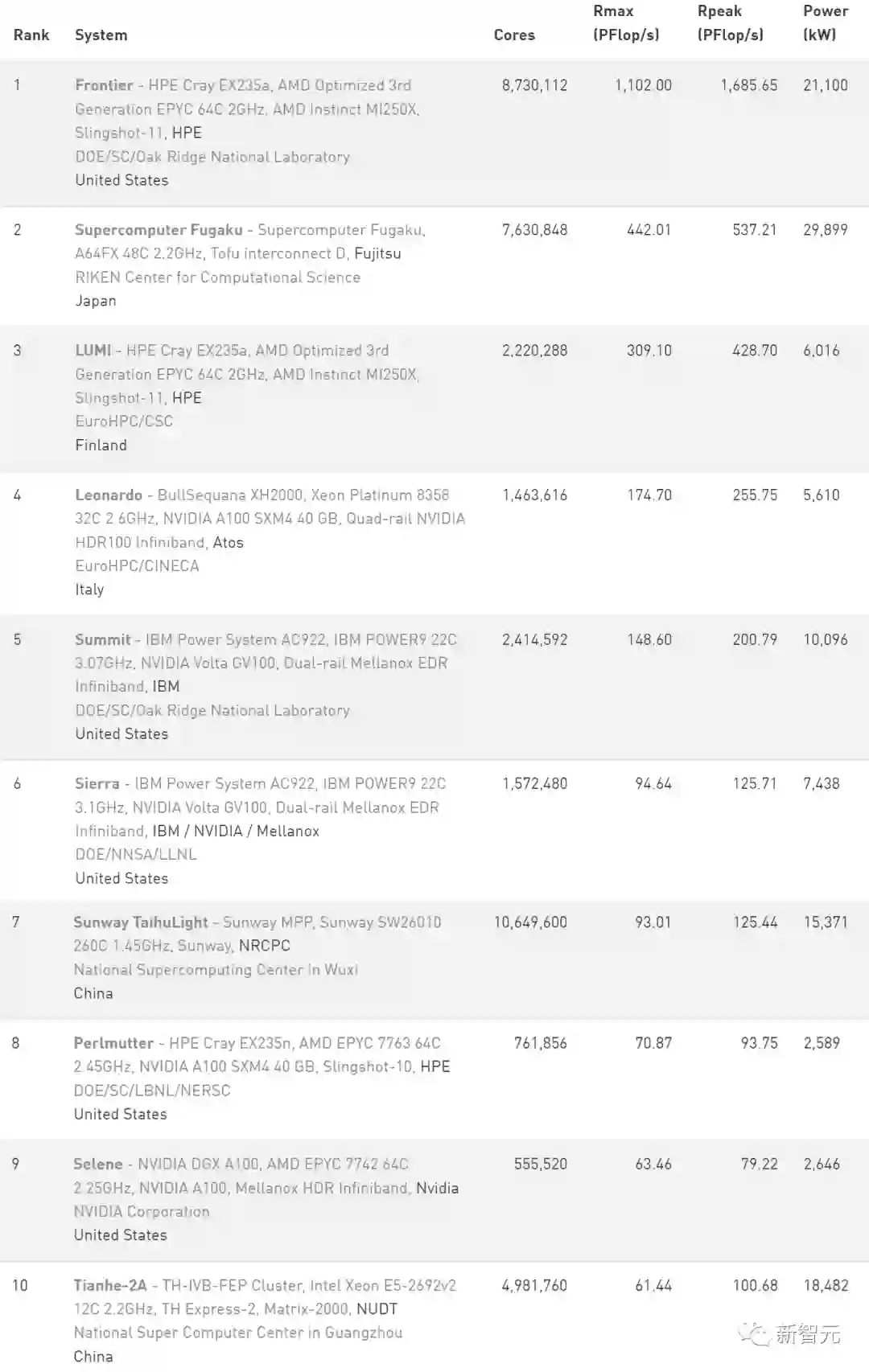 其中,Frontier使用针对HPC和AI优化的Gen AMD EPYC处理器,排名第三的LUMI系统同样如此。