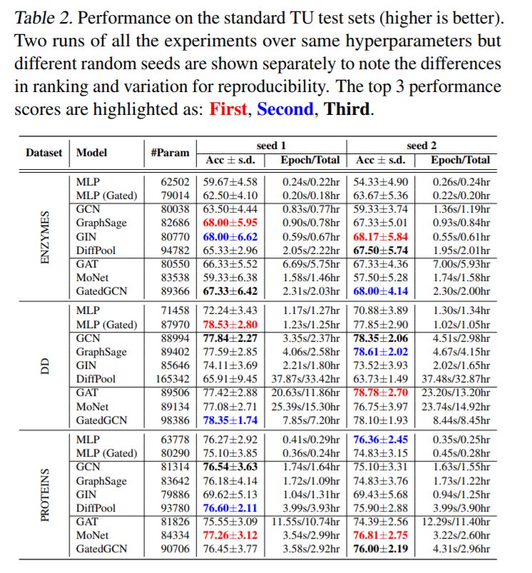 与图形无关的NNs (MLP)在小型数据集上的表现与GNNs一样好。表2和表3显示,对于小型TU数据集和(简单的)MNIST,使用GNNs而不是不依赖于图的MLP基线并没有显著的改进。此外,MLP有时比GNNs做得更好(Errica等,2019;Luzhnica等人,2019年),例如用于DD数据集。
