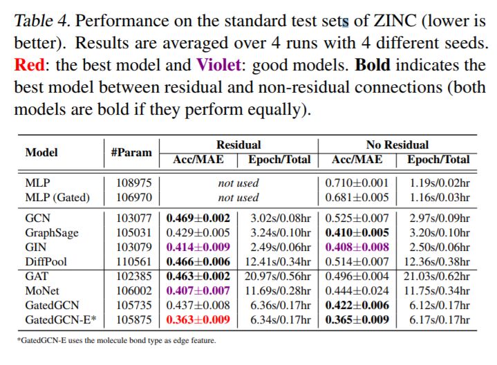 各向异性GNN是准确的。各向异性模型,如GAT (Velickovi ˇ c et al. ´ , 2018), MoNet (Monti et al., 2017) and GatedGCN (Bresson & Laurent, 2017) 在每个数据集获得最好的结果。另外,我们注意到GatedGCN在所有数据集上都表现良好。与各向同性的GNNs主要依赖于对相邻特征的简单求和不同,各向异性的GNNs使用复杂的机制(GAT的稀疏注意机制、GatedGCN的边缘门),这些机制很难有效地实现。我们为这些模型编写的代码并没有得到充分的优化,因此,速度要慢得多。这类GNN的另一个优点是它们能够明确地使用边缘特征,比如分子中两个原子之间的键类型。在表4中,对于ZINC分子数据集,使用键边特征的GatedGCN- e显著改善了没有键的GatedGCN的MAE性能。