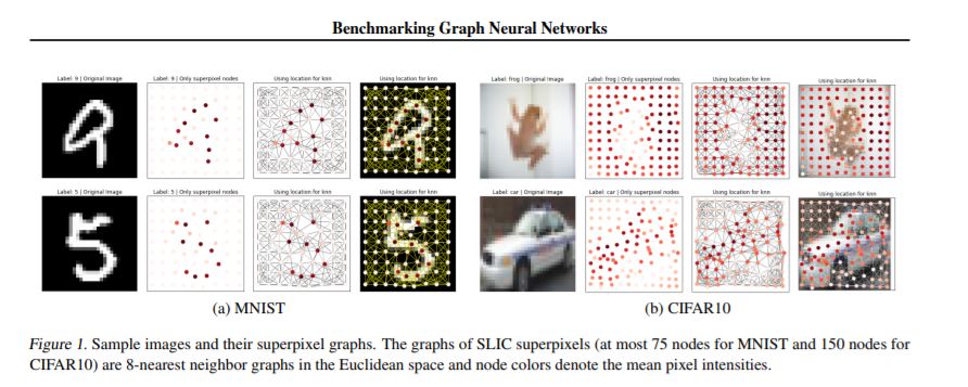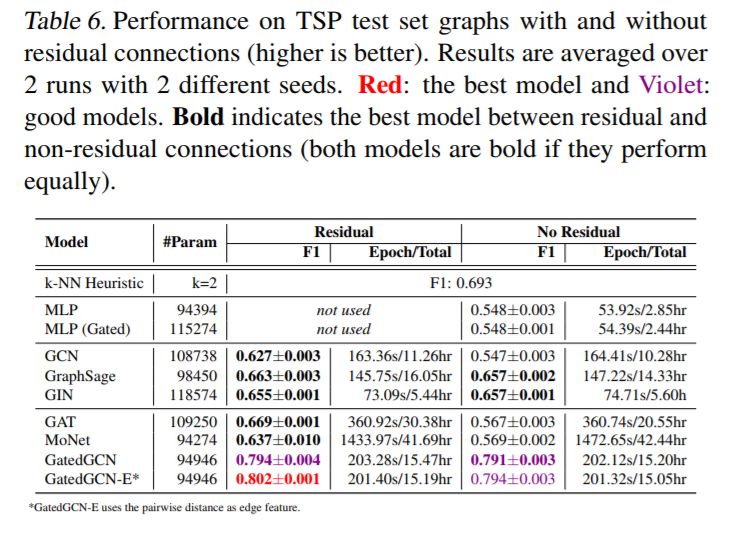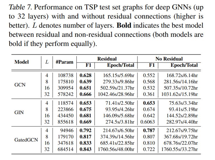对于更大的数据集,GNN超越了与图形无关的NNs。表4和表5显示了ZINC, PATTERN, 和CLUSTER 数据集的显著性能提升,其中所有GNN都大大优于两个MLP基线。表6显示,所有使用残差连接的GNN都超过了TSP数据集的MLP基线。表3中报告的CIFAR10数据集的结果差别不大,尽管最好的GNN的性能明显优于mlp。