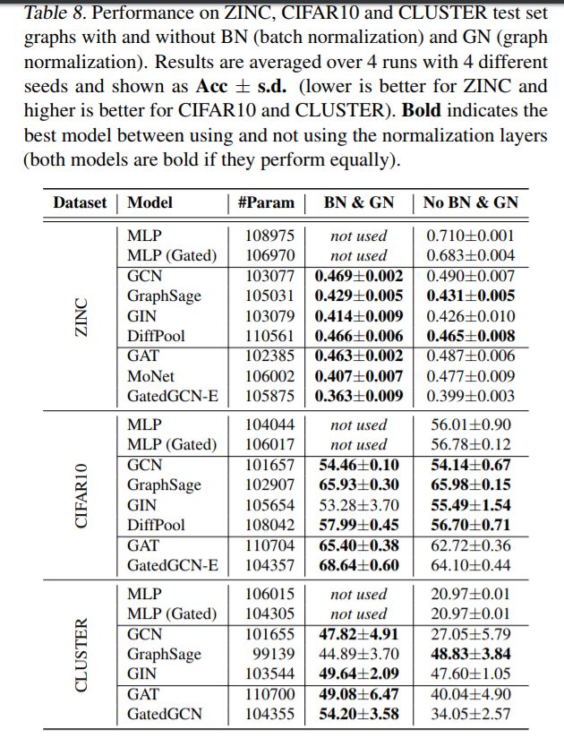我们在表8中评估了标准化层对ZINC、CIFAR10和CLUSTER数据集的影响。对于这三个数据集,BN和GN显著改善GAT和GatedGCN。此外,BN和GN对ZINC和CLUSTER簇的GCN性能有促进作用,但对CIFAR10的GCN性能没有改善。除了集群之外,GraphSage和DiffPool不会从规范化中受益,但不会损失性能。总之,规范化层对于设计完善的gnn非常重要。