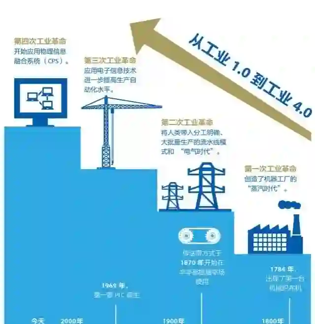 工业1.0是机械化生产的蒸汽时代,2.0是大批量生产的流水线模式和“电气时代”,工业3.0是高度自动化的电子信息技术时代,那么工业4.0就是建立在信息物理融合系统(CPS)之上、虚实融合的“网络化生产时代”。