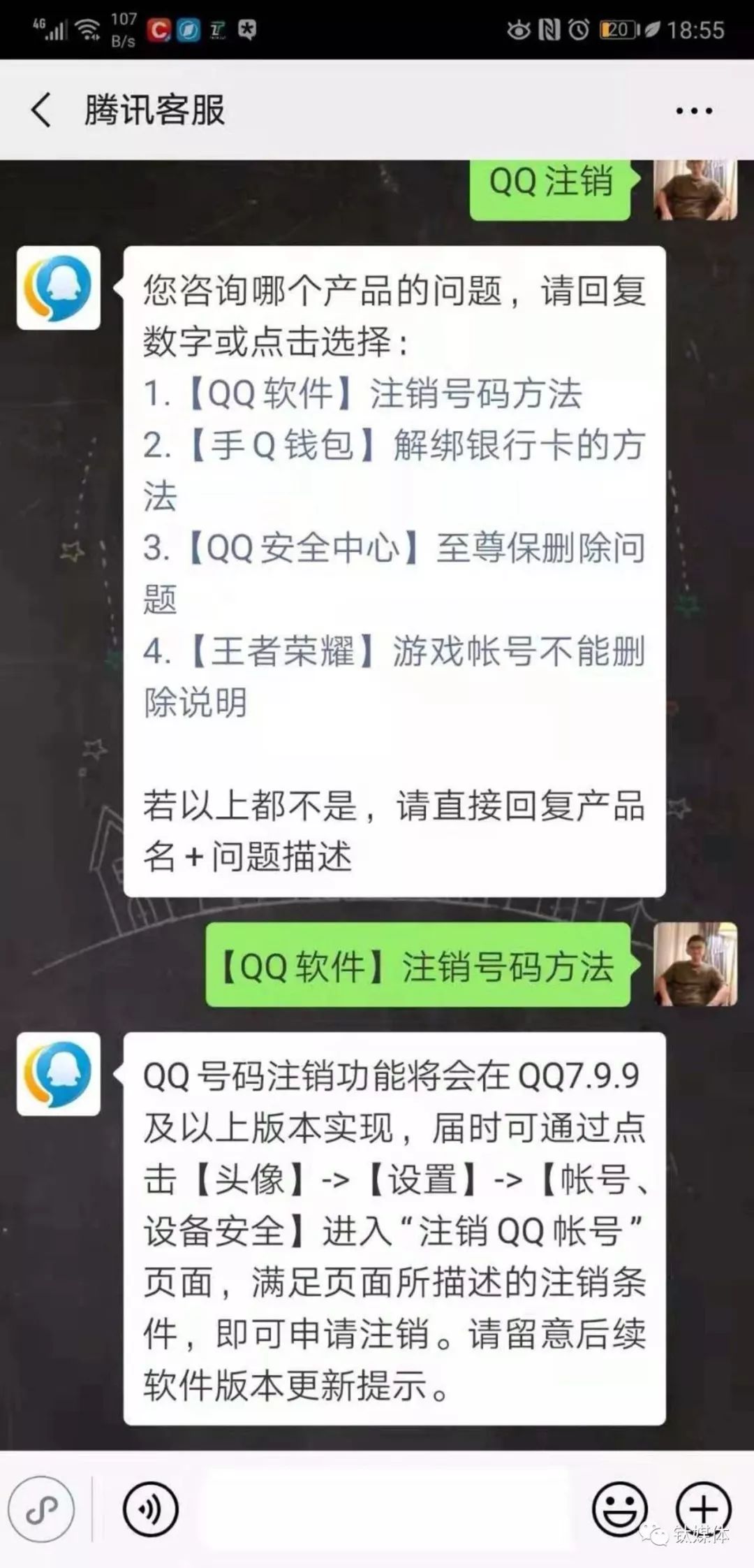 3月4日,有报道称,在腾讯客服微信公众号中回复“QQ软件注销”,可以得到关于QQ号注销的消息。(查看钛媒体此前文章《再见QQ,再见青春》)