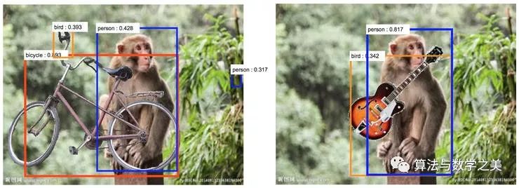 第三,深度学习对于图像中的变化过于敏感,人类则难以被欺骗得多。我们不仅已经知道标准的对抗性攻击可以对图像做出人类无法感知的微小改变,但可以让深度神经网络的识别结果发生彻底的变化,同时神经网络还对背景环境的变化过于敏感。下图中,研究人眼们把不同的物体拼贴到一张森林中的猴子的照片上。这会让深度神经网络把猴子误识别为人,同时也把吉他误识别为鸟,我们猜测这大概是因为「拿着吉他的更有可能是人类而不是猴子」以及「树林中的猴子周围更有可能出现一只鸟而不是吉他」。深度神经网络记忆相关性的能力在此时反倒成了累赘。近期有许多研究都挖掘了深度神经网络对于背景环境变化过于敏感的问题。