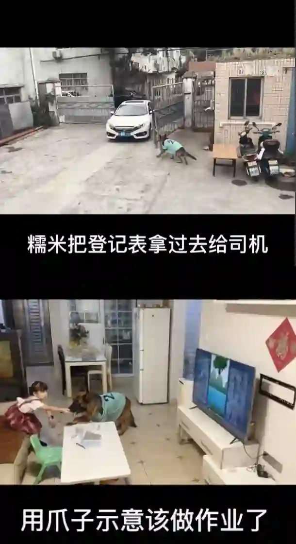 德牧犬“糯米”是一个智商近似于成年人的狗,可以取快递、看大门、监督小孩写作业、接孩子放学、帮人看倒车。主人为他塑造的形象,和家里的大管家无异。