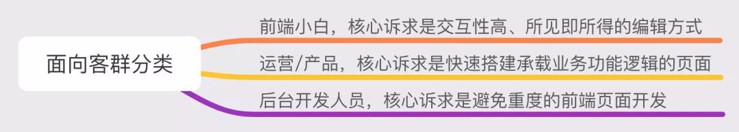 页面可视化搭建工具的面向客群是指工具的的使用客群. 不同的使用客群, 其对页面技术的认知程度、搭建页面的诉求有所不同, 所以可以从工具的面向客群来区分不同工具.
