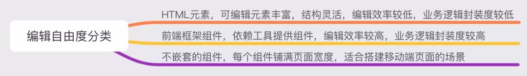 编辑自由度为 HTML 元素的页面搭建工具有以下特点: 可编辑的元素丰富、页面结构灵活、可视化编辑效率较低、业务逻辑封装度较低. 这类工具的可编辑单元为 HTML 元素, 可以编辑元素的文本、样式和行为, 可编辑的元素较丰富; 并且可以组合各种 HTML 元素到页面中, 生成的页面结构灵活; 从生成页面的角度, 编辑出一个页面需要从基本的 HTML 元素开始搭建, 可视化编辑的工作量较大; 一个业务功能的实现, 通常需要渲染多个 HTML 元素, 而这类工具可以自由增删业务所需的 HTML 元素, 这导致无法固定地承载业务功能, 所以这类编辑工具生成的页面, 业务逻辑封装程度较低.