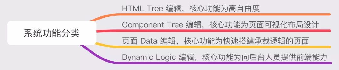 页面可视化搭建工具的系统功能是指该工具在解决特定页面可视化搭建问题上提供的核心能力. 页面是由 HTMLTree, Data 和 DynamicLogic 三部分组成, 一个页面可视化搭建工具提供的能力是编辑页面组成部分之一或多部分. 对基于组件的页面, 其可编辑单元为组件, 此时采用 ComponentTree 概念取代 HTMLTree.