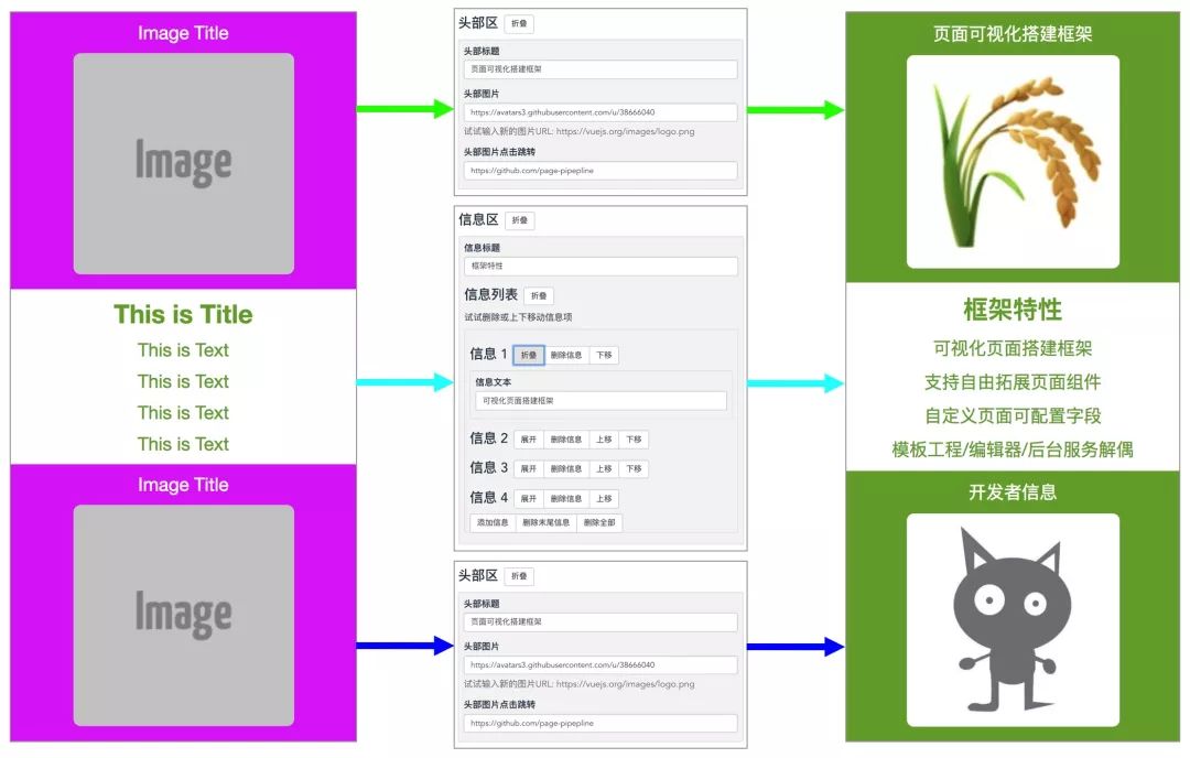 编辑系统和组件解偶,组件只需要遵循编辑系统的组织约定, 其具体开发过程和承载的逻辑与编辑系统无关, 支持自由拓展页面组件. 编辑系统与模板采用的前端框架解偶, 在遵循编辑系统约定下, 可以选择不同的前端框架.