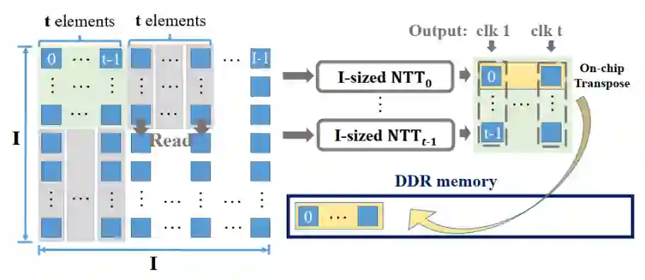 针对 POLY 部分,研究员们主要采用了 number theoretic transforms(NTT)算法进行处理(如图5)。为了处理 zk-SNARK 中 POLY 计算规模太大,从而造成 ASIC 片上计算资源及片下内存访问速度太慢的问题,研究员们设计了一种高效的流程来将大规模的 NTT 迭代分解为小规模 NTT,并使用 FIFO 等数据结构来提升内存的访问效率。除此之外,研究员们还使用了 data tiling 以及片上矩阵转置等方式来提升片下内存的效率。通过 PipeZK 系统,POLY 部分可以被加速20倍以上。