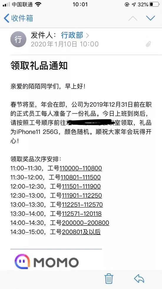 1月9日,有陌陌员工晒出内部邮件,邮件显示,公司为2019年12月31日前在职的正式员工每人准备了一份礼品,礼品为iPhone 11 256G,颜色随机。