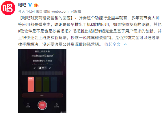 针对新推出的弹唱功能和唱鸭高度相似的传言,唱吧在微博回应称,弹奏这个功能行业里早就有,多年前节奏大师等应用都是弹奏类。