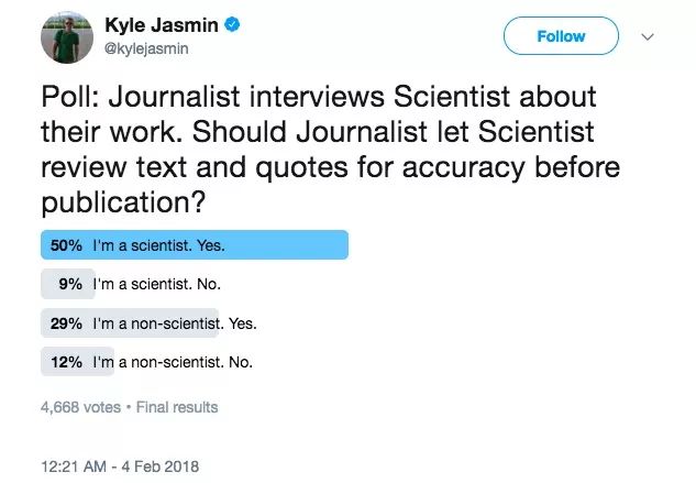 争吵了一年后,这件事就在没有后续发展的情况下尘埃落定了。那么为什么这一次,这个陈年话题又进入了人们的视野呢?——因为调查结果显示,虽然有79%的人赞同应该在发表前把稿件给科研人员审阅,但也有21%不认同这种做法。而把科学家和非科学家两个群体区分来看,投票给“NO”的比例又各自占了15%和29%。