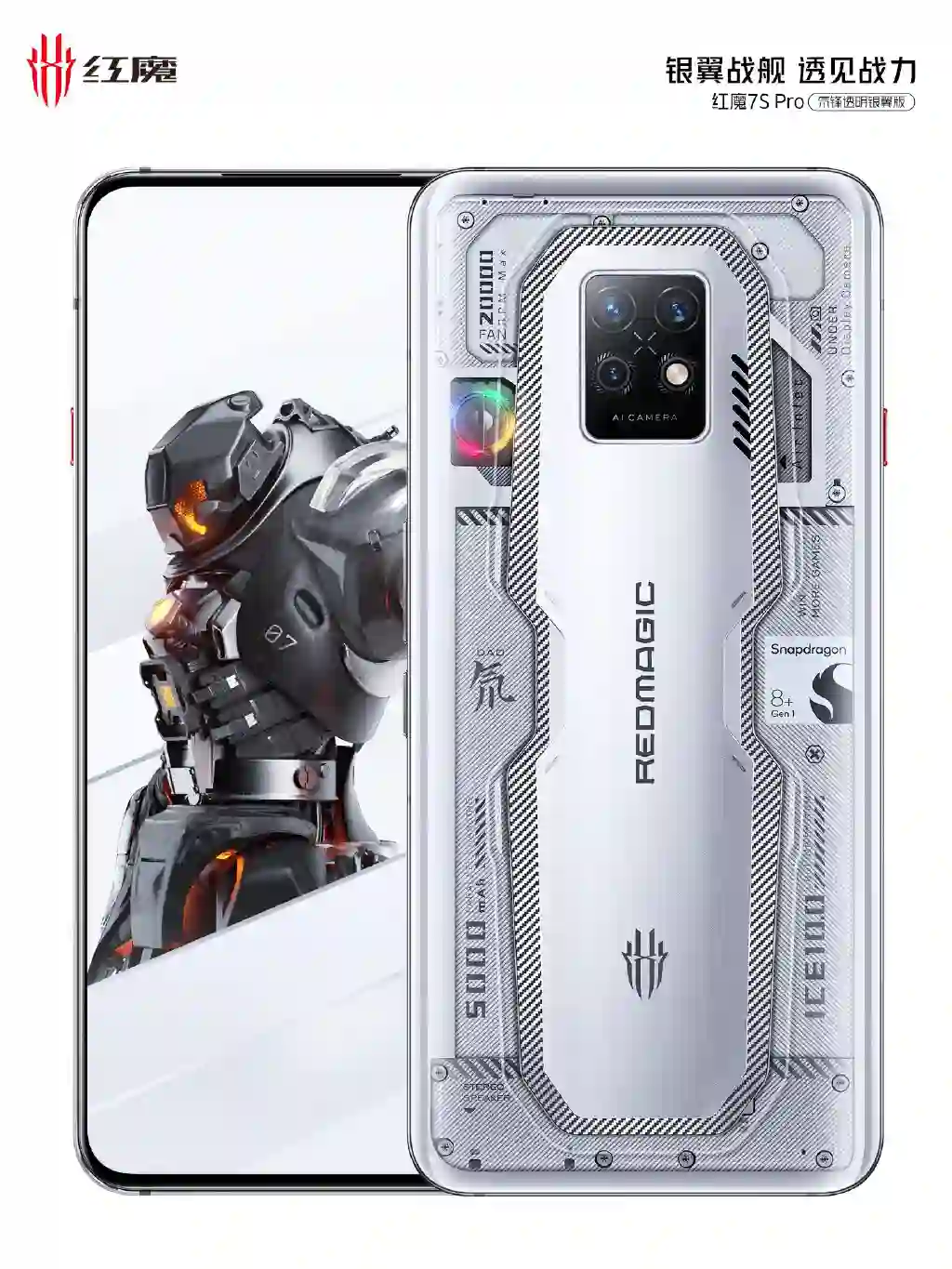 红魔游戏手机官方今日宣布,红魔 7S 系列暨游戏新装备发布会将于 7 月 11 日 15:00 举行。目前红魔 7S Pro(型号 NX709S)、红魔 7S(型号 NX679S)现已通过工信部入网审核以及 3C 认证。随后,红魔 7S Pro 氘锋透明银翼版的官方海报也被公布,红魔 7S Pro 氚锋透明银翼版的整体 ID 设计基本沿袭了此前的红魔 7 Pro,而且采用屏下摄像头,正面一整块屏幕观感极佳。另外,极具未来科幻感的银色透明机甲后盖设计也配备其上,似乎还有支持 RGB 灯光的散热风扇。