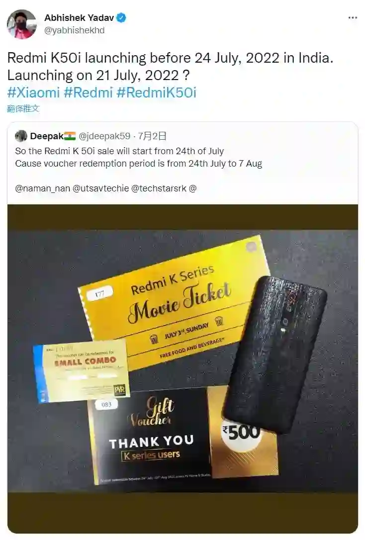 据海外博主 @Abhishek Yadav 今日爆料,Redmi 会在 7 月 24 日发布 Redmi K50i,该机配置跟国行版 Redmi Note 11T Pro 系列相近。和 K50 对比,Redmi K50i 采用的是 LCD 全面屏,分辨率为 FHD+,刷新率为 144Hz(K50 采用三星 2K 120Hz 屏幕)。该机搭载了联发科天玑 8100 旗舰处理器,采用台积电 5nm 工艺制成打造。此外,Redmi K50i 配备 8GB 内存、128GB 存储,前置 1600 万像素,后置 6400 万主摄、800 万超广角和 200 万副摄,电池容量为 5000 毫安,支持 67W 有线快充。