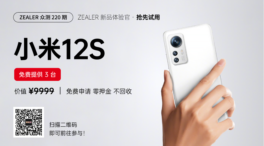 抢先试用!小米 12S 上线 ZEALER 众测!搭载全新骁龙 8+,能效跃升、功耗猛降!升级影像性能,从画质到影调都很「徕卡」!还有更多新机亮点等你解锁!免费申请、零押金、不回收。扫上方二维码或戳左下角「阅读原文」即可前往参与。