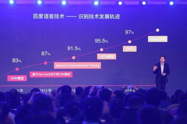 2015 年 8 月,百度研究院新增了汉语的识别能力,准确率高达 94%。这也让端到端的深度学习算法成为语音识别提升最重要的手段之一。在 2015 年 9 月份的百度世界大会上,吴恩达也在较为嘈杂的情况下,验证了机器的语音识别已经超过人类;而李彦宏彼时也宣布,百度语音识别的准确率能够达到 97%。