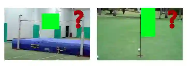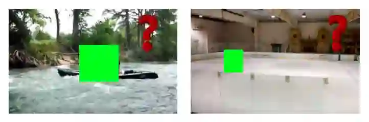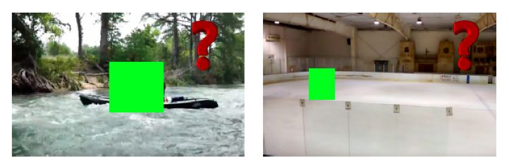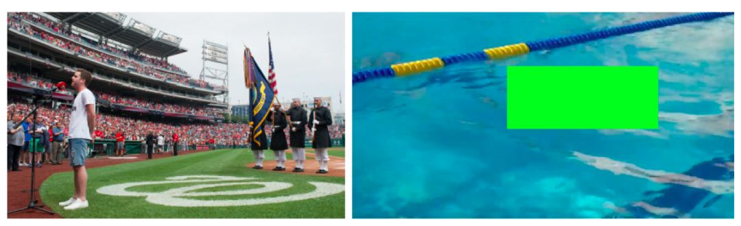 这种场景偏差在一些情况下会导致模型产生我们不希望看到的效果。如图2所示,左图中,由于棒球场的背景,唱歌的人会被错误地预测为在打棒球,而在右图中,即使我们把游泳的人完全挡住,模型也会由于对游泳池背景的识别,给出游泳的预测结果。