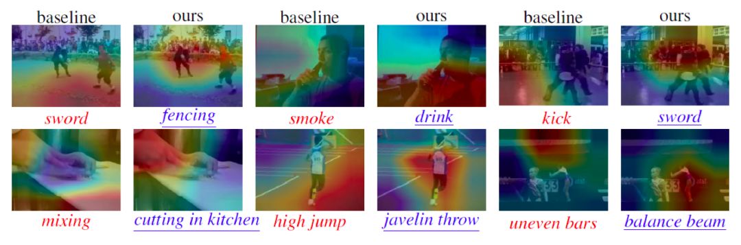 图5. HMDB-51和UCF-101两个数据集上的类激活映射举例。蓝色下划线字体表示正确的分类,而红色字体代表错误的分类。