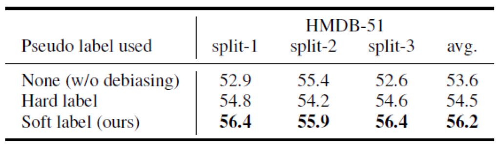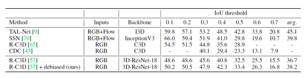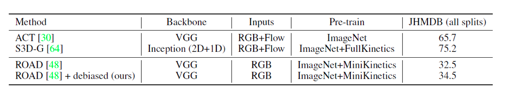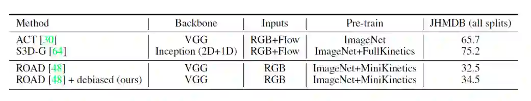 为了验证所提方案的有效性,这篇论文在三种动作理解任务上进行了实验:动作分类,时序动作定位和时空动作识别。实验结果表明采用了偏差去除的迁移学习方案要比基准模型表现更好。