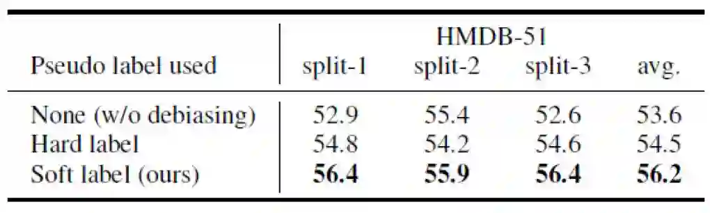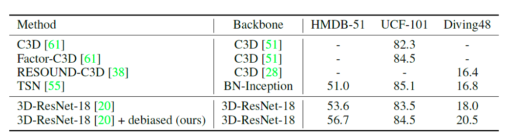 在动作分类任务上的实验结果如表1所示。通过增加去除场景偏差的操作,三个数据集上的表现都有所提高。