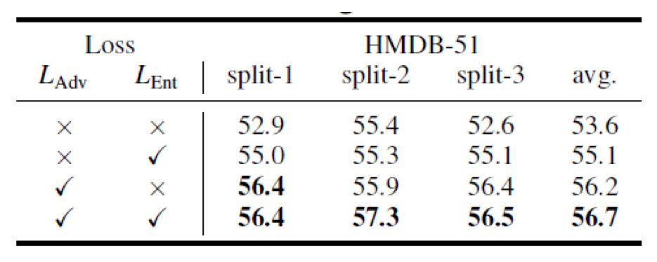 在HMDB-51数据集上,这篇论文进一步完善了伪场景标签和不同损失函数组合的情况。表4验证了使用软场景标签的方式能够更好地提升表现,而表5验证了同时使用场景对抗损失和人体遮挡混淆损失能带来最大的性能提升。