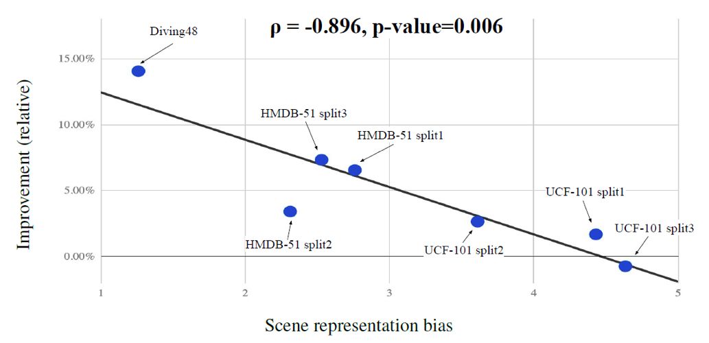 图4. 相对的准确率提升与场景表征偏差之间的负相关。UCF-101和HMDB-51的不同划分方式会有不同的结果。