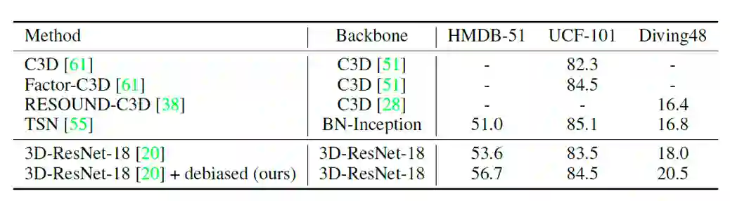 这篇论文关注了一个之前研究较少涉及的问题,即动作识别中的背景偏差消除问题,并且提出了一种有效的方案,包含了两个新提出的损失定义,即场景对抗损失和人体遮挡混淆损失。在动作分类,时序动作定位和时空动作识别这三类不同任务上的大量实验表明了这篇论文所提方案的有效性。