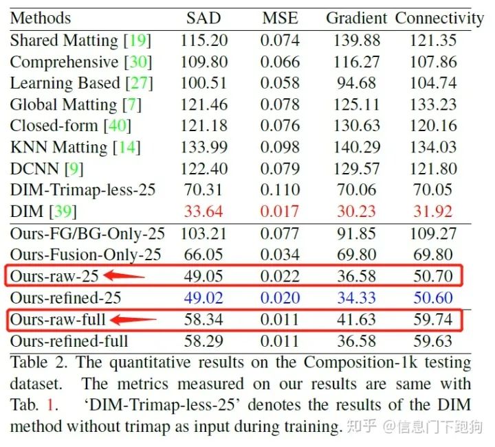 这里Ours-raw-full的意思是指LFM方法在没有经过guided filter进行后处理时对整张图算4个指标(SAD、MSE、Gradient、Connectivity)得到的结果。而Ours-raw-25是指仅仅在alpha matte的transition region进行dilation 25 pixels得到一个区域,计算这个区域下LFM对于alpha matte的预测与ground-truth alpha matte的差异得到四个指标的值。可以看到,从在LFM 报告的结果来看,无论是哪种计算方式都不会与DIM相差甚远,并且远远优于除DIM外的所有方法。这就非常尴尬了:)