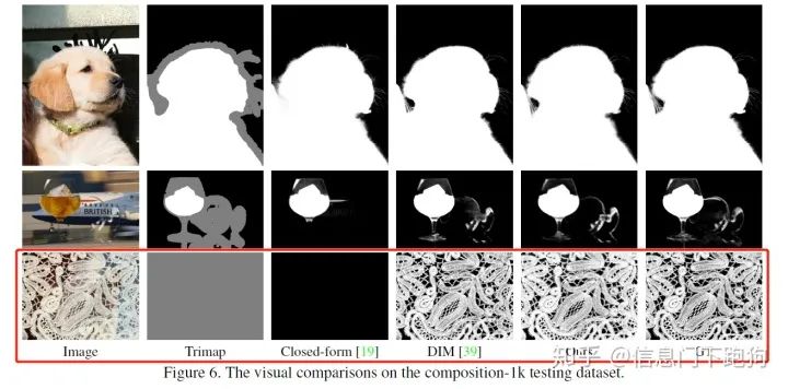 文章中Figure 6给出了含trimap作为输入的SOTA方法以及不含trimap的全“自动化”抠图的SOTA,即LFM以及该论文自身的结果对比: